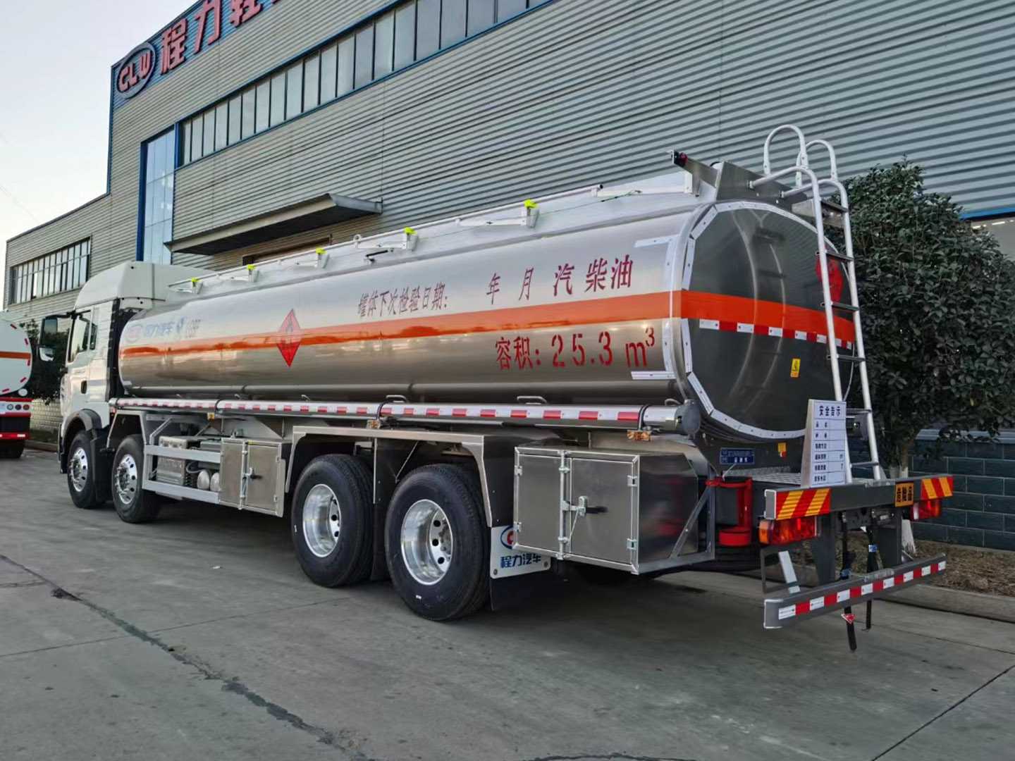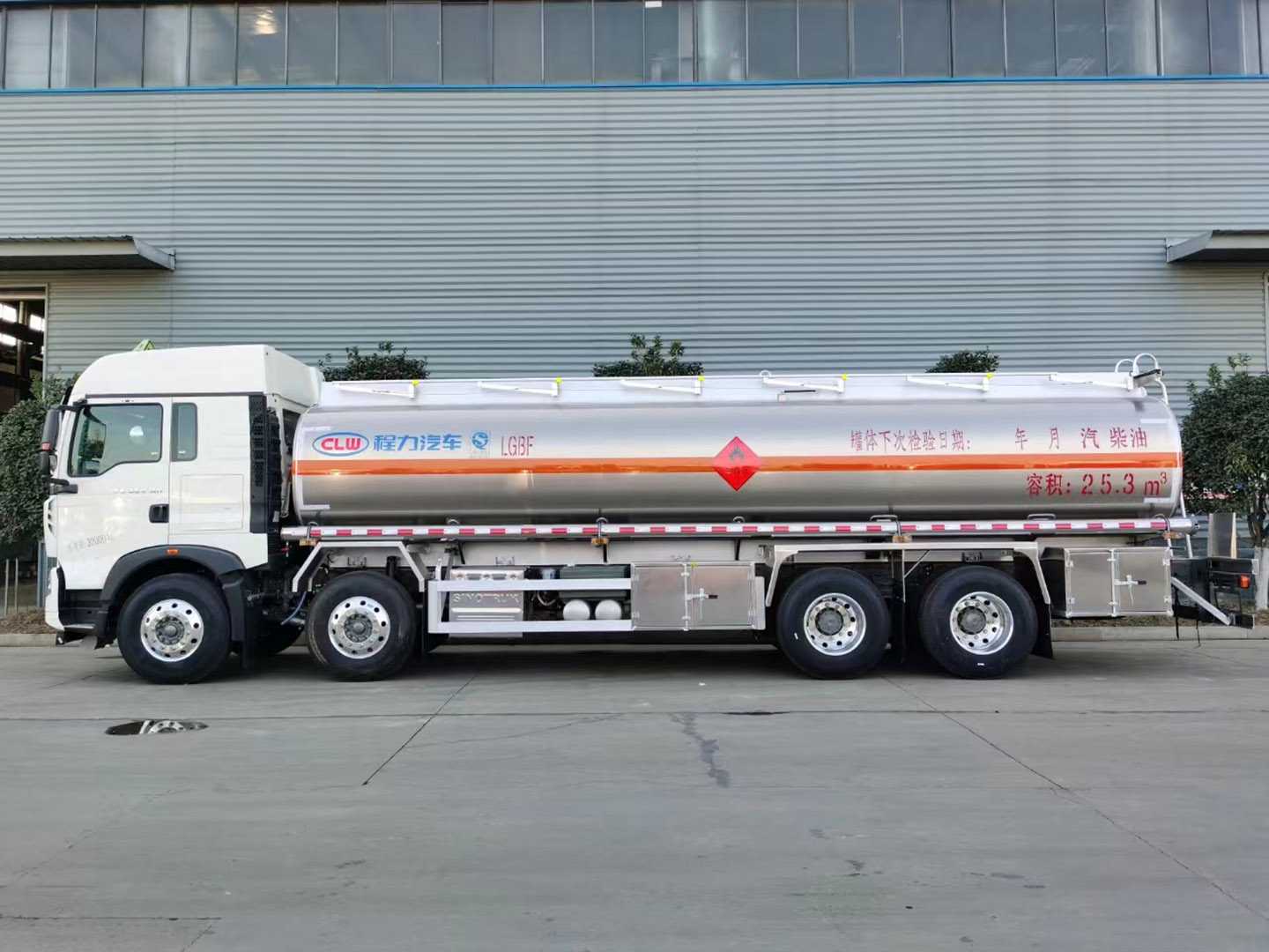 The Howo 25.5 cubic meter 4x8 oil tanker truck (compliant with China VI emission standards) features the following configuration: effective tank volume: 25.5 cubic meters (diesel/gasoline tank) or 30 cubic meters (gasoline tank); 5182 aluminum alloy sheet; 6mm thick tank body, 6mm thick end caps, 6mm thick partitions; single compartment; two European standard tank openings on the top; one new-standard intelligent shut-off bottom valve; one set of bottom loading system (unloading valve, oil vapor recovery, anti-overflow probe, anti-static reel); equipped with an 80-60 dedicated oil pump (capable of pumping in and out); rear ladder, manual guardrails, toolbox, rear bumper, and side guardrails are all made of aluminum alloy sheet and manufactured according to the new standards. Other manufacturers' standard configurations are not included.